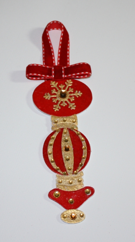 I designed this ornament in Inkscape to cut on my Cricut. It was a VERY long process, as I worked off and on all day on creating a ornament, only to lose every thing. I was not smart enough to save my work as I went along, and Inkscape froze up. Now, I would think I would have been smart enough to save it, as this has happened to me several times. This ornament is different than the one I lost, I had alot of intricate designs in it. However, I am very happy with the way this one turned out. I heat embossed the whole thing in red and gold. The snow flake is from one of MS's punches.
