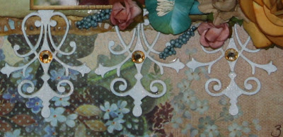 I used a portion of Dusty Attics chipboard, painted it with white acrylic and then coated it with Distress Clear Rock Candy. Once dried, I dabbed on some Broken China distress ink and added some bling.